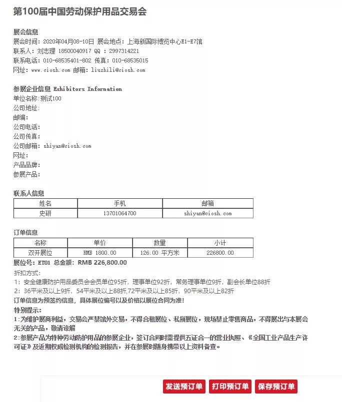 ⑥ 选位一经提交,系统自动生成预订单,即刻进入订单审核状态。完成审核前将无法再次登录,如需改动请联络会展公司010-68535315/5401/5417予以协助。